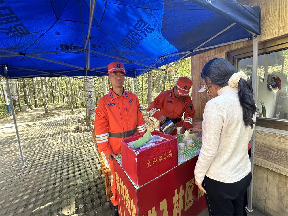 “带着孩子走得又累又渴,多亏了森防队员们递来的热水!”来自吉林市的游客王女士一边喝着热水,一边对森防队员的暖心服务赞不绝口。在东北抗联蒿子湖密营,面对游客对红色历史的浓厚兴趣,队员们还主动讲述他们所了解的抗联故事,让红色记忆在生动的讲述中更添温度。“我年纪大了腿脚不利索,这些孩子们一路搀着我到纪念馆,还帮我照看行李,比亲人还周到!”一位来自黑龙江的老年游客动情地说道。
