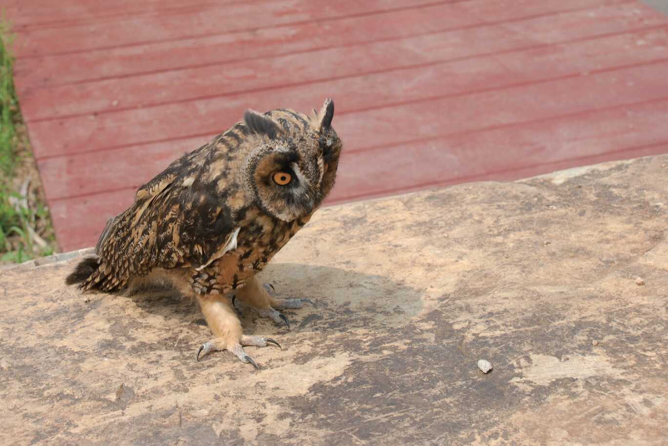 【形态特征】头具显著耳状饰羽,上体棕黄色有黑褐色斑纹,下体棕黄色有黑色纵纹;飞翔时翅膀下面棕黄,腕掌骨处有黑斑。