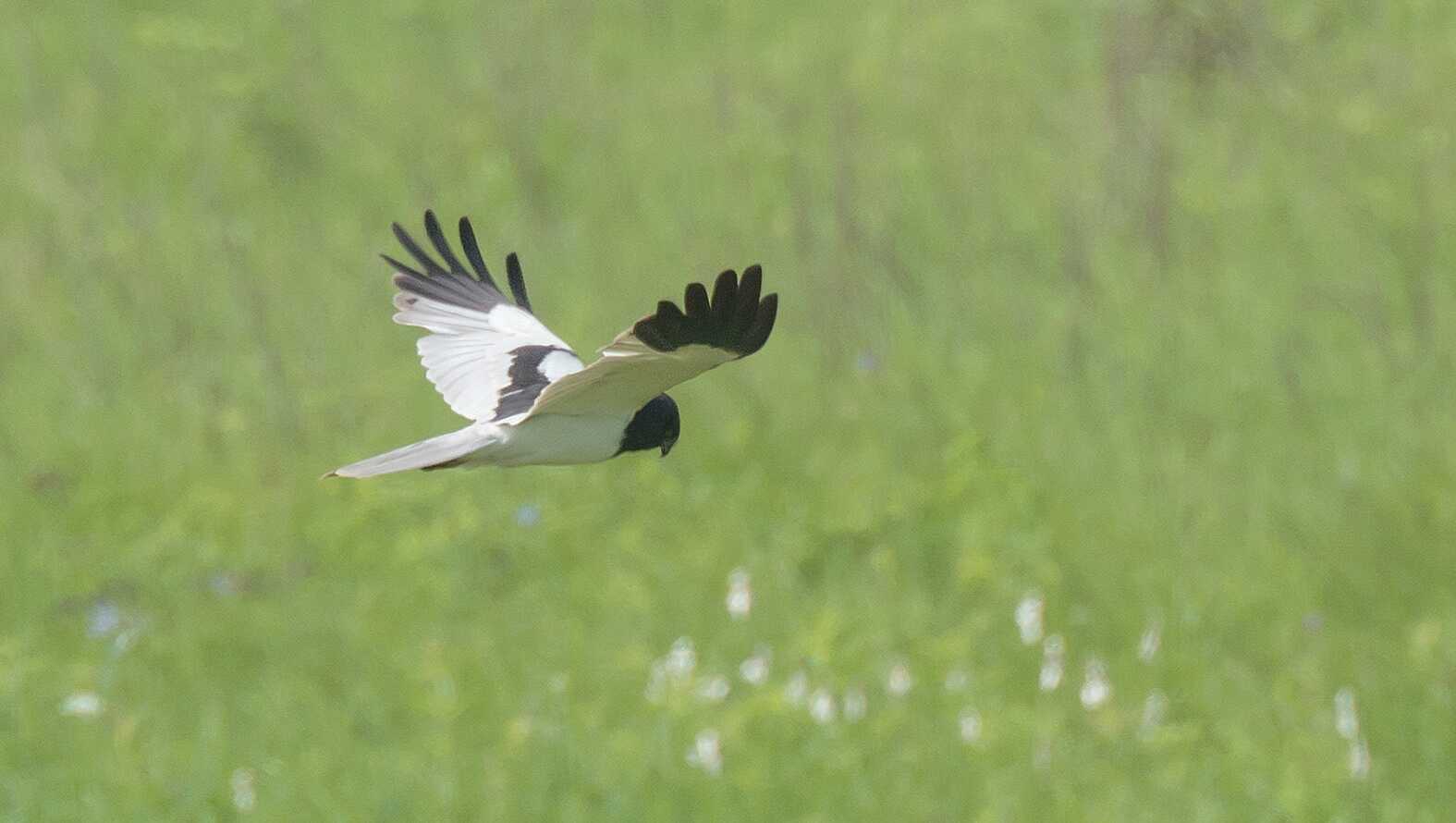 【形态特征】雄鸟头黑色,初级飞羽蓝黑色,其它体羽白色,背部有一个T形黑斑,黑白界限分明。雌鸟主体灰褐色。