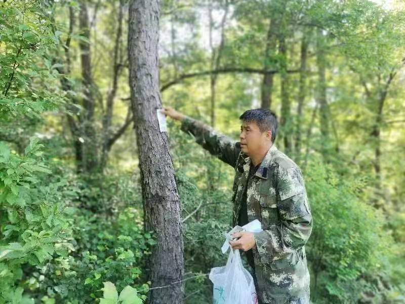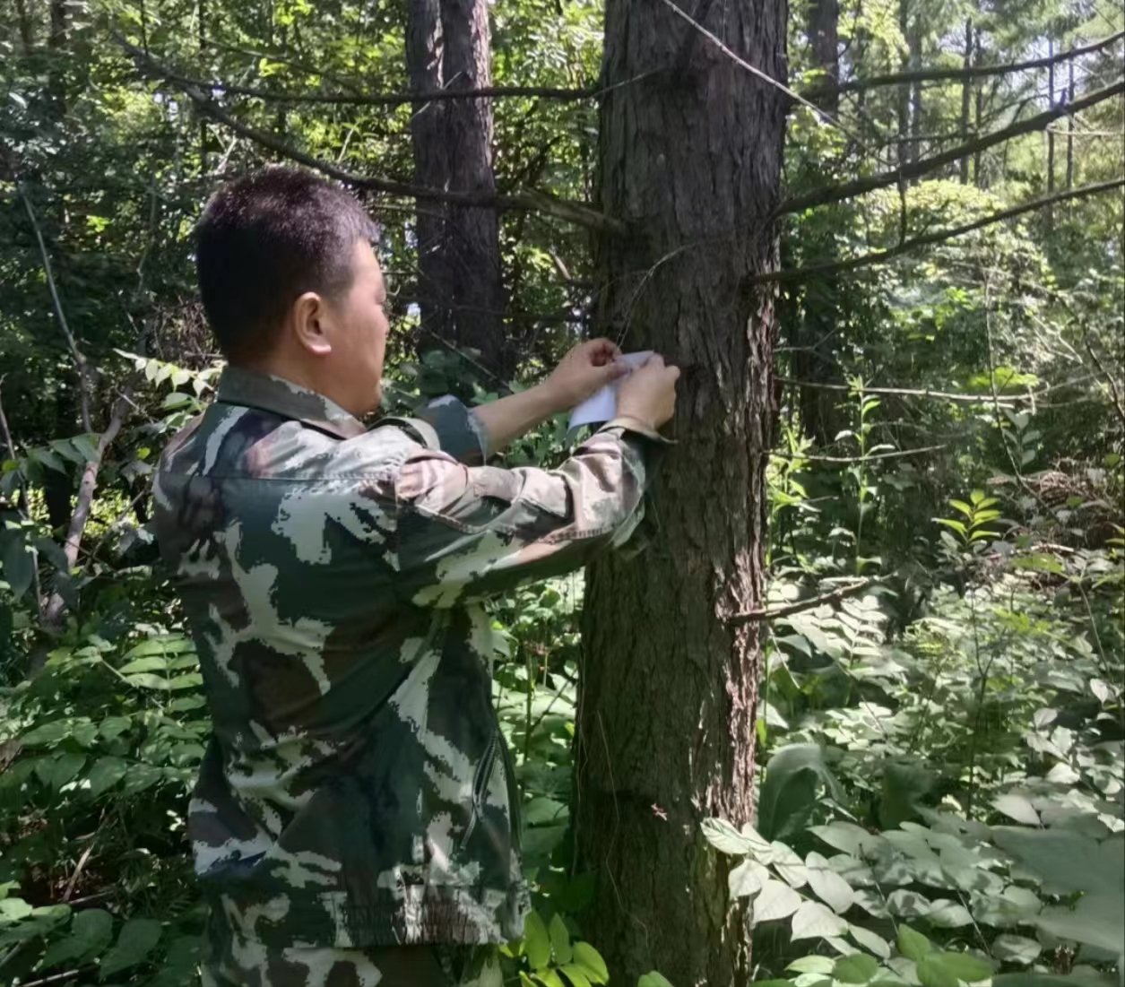 蛟河市青背林场根据对辖区红松球果害虫实地调查监测情况,在成虫产卵期间,利用蜂卵相遇寄生的特性,及时组织技术人员对辖区红松果害虫投放赤眼蜂卡进行防治,技术人员严格按照投放标准,将蜂卡有卵粒的一侧朝内,用图钉固定在红松背面位置。截止目前,蛟河市青背林场共释放赤眼蜂卵卡60余张,每张赤眼蜂卵卡可羽化出赤眼蜂成虫约3000头,可有效防治松毛虫,促进辖区松林健康生长,保护森林资源。
