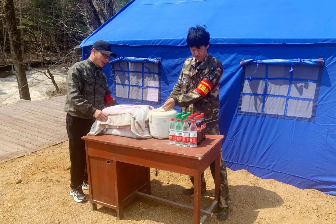 志愿者们在九叠瀑景区空地搭建帐篷,为游客提供避雨、避暑场所。公园管理部、兰家林场、国有林管理分局兰家站集资购买玉米、茶叶蛋、饮料和矿泉水,在景区内为游客提供便民服务。