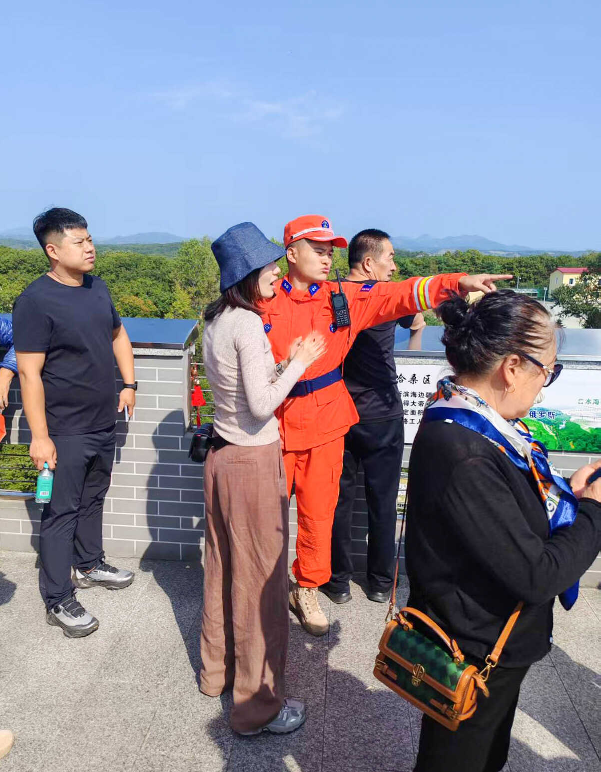 温情故事在林间不断上演。一位防火队员正伸出手臂,为几位游客指引远方的风景,并详细讲解着景点的历史和特色。他们目光所及,是吉林秋日的壮美山河和丰富文化。在观景平台,另一位防火队员主动接过游客的手机,帮忙拍下与家人的珍贵合影,身后的警示牌“禁止倚靠”也成了无声的安全提醒。还有一位防火队员抱起一个小朋友,并把手中的望远镜递给他,助力孩子“登高望远”。更有几位防火队员为爆胎车辆,以最快速度更换了轮胎,得到了车主的连连称赞。