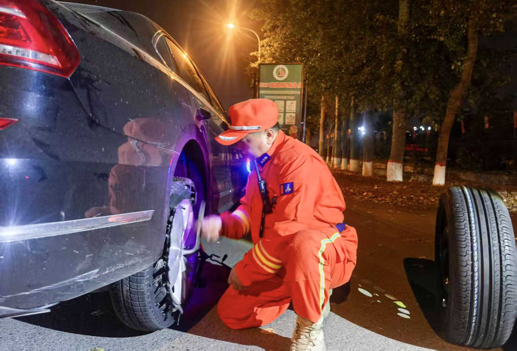 10月5日晚,珲春市森林火灾预防中心防火队员为游客爆胎车辆义务换轮胎