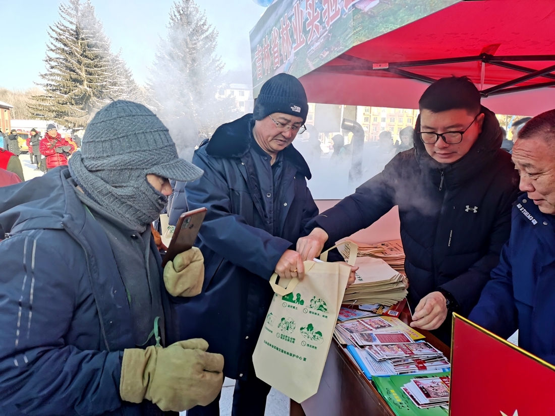 活动现场暖意融融、热闹非凡,浓郁的关东烟火气扑面而来。铿锵有力的锣鼓声中,秧歌队舞步翩跹,点燃了现场氛围。柴火灶上,东北杀猪菜、小鸡炖蘑菇香气扑鼻,现磨豆浆暖意绵长。展位上,椴树蜜、松子、大榛子、林蛙油、榛蘑、木耳、山野菜等各类林农产品琳琅满目,这些产自优质生态环境的特色产品,既是保护中心深耕生态管护、培育林下经济的成果,也是当地群众增收致富的“生态珍宝”。此外,蛟河市书法家们现场挥毫泼墨,一幅幅饱含祝福的春联、福字与漆扇送到群众手中,将文化温情与新春祝福传递到千家万户。