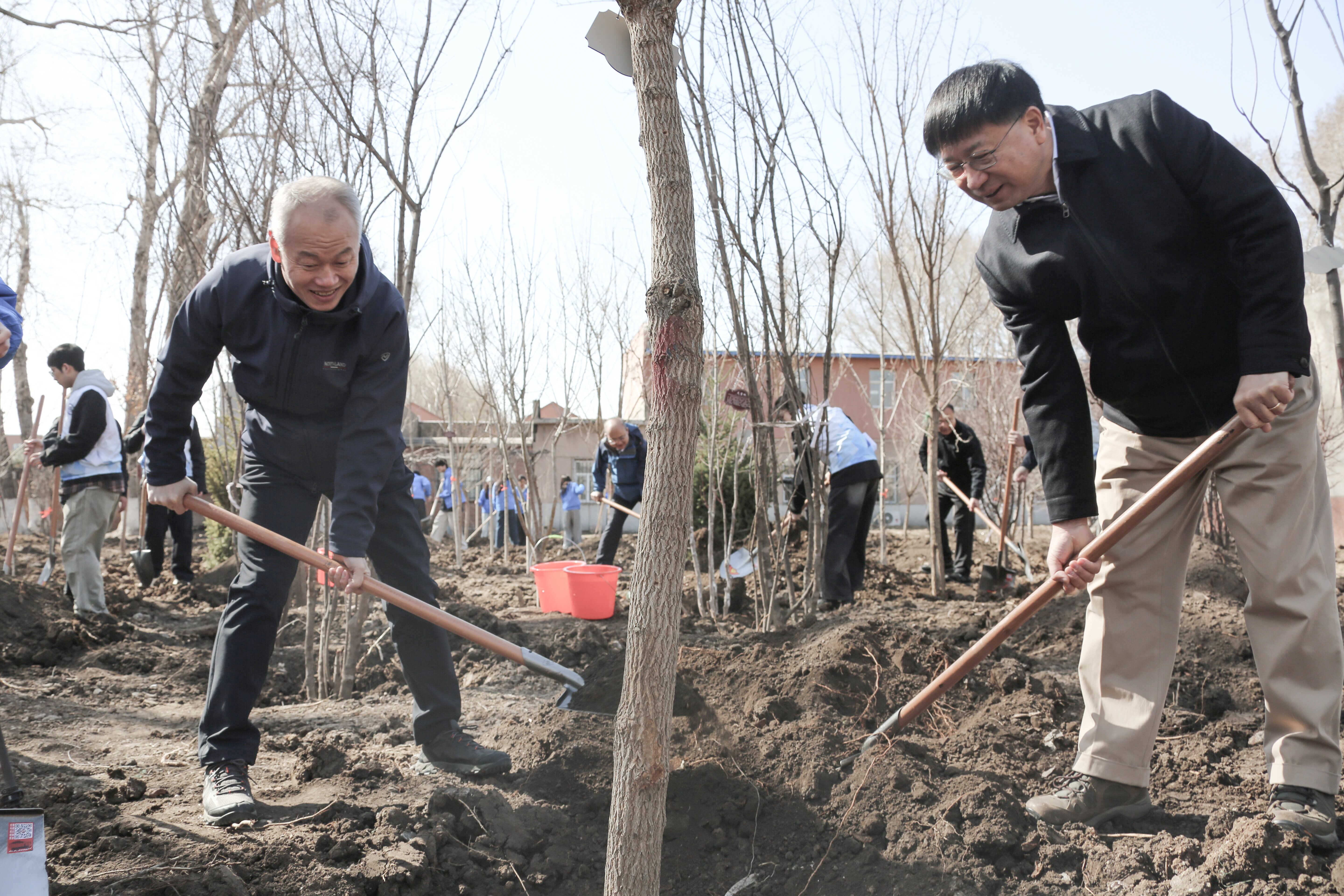 活动现场,省林草局与吉大领导并肩协作、率先垂范,按照分组安排与结对学生默契配合,扶苗、培土、围堰、浇水,每道工序规范科学,植树现场秩序井然、氛围热烈。