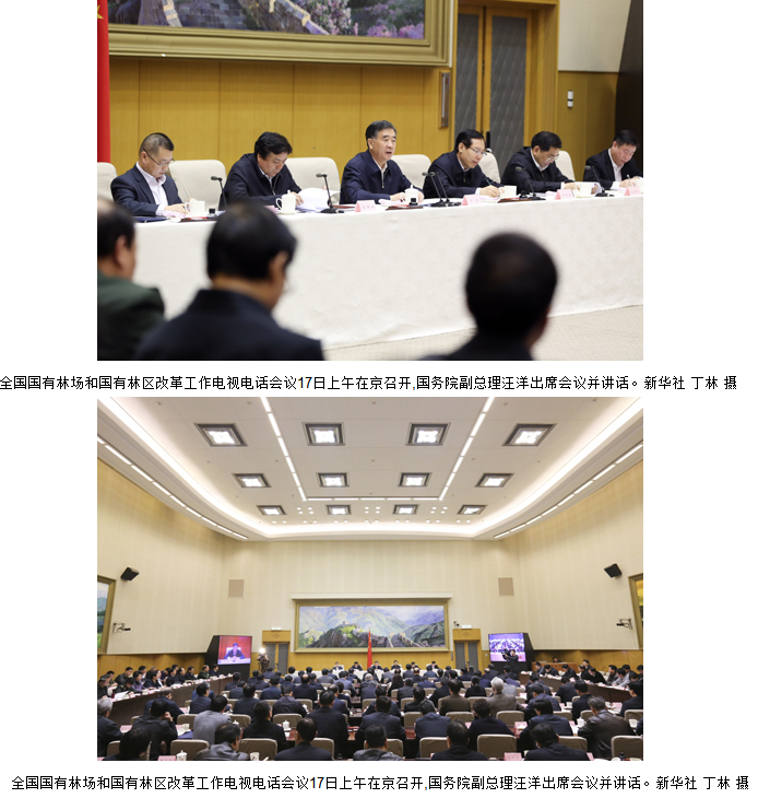 全国国有林场和国有林区改革工作电视电话会议17日上午在京召开,国务院副总理汪洋出席会议并讲话。他强调,要认真贯彻落实党中央、国务院关于深化国有林场和国有林区改革的决策部署,围绕发挥生态功能、维护生态安全的战略定位,加快健全森林资源监管体制,创新资源管护方式,完善支持政策体系,推动林业发展由木材生产为主转向生态修复和建设为主、由利用森林获取经济利益为主转向提供生态服务为主,为促进生态文明建设和经济社会可持续发展提供有力保障。