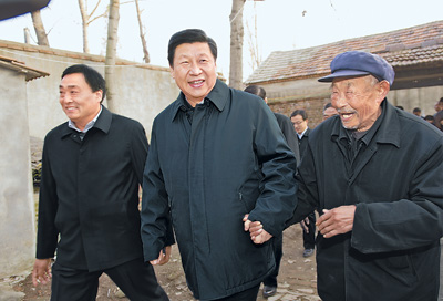 11月25日下午,习近平在地处沂蒙老区的临沭县曹庄镇朱村亲切地拉着83岁的“老支前”王克昌的手去他家看望。记者 谢环驰 摄