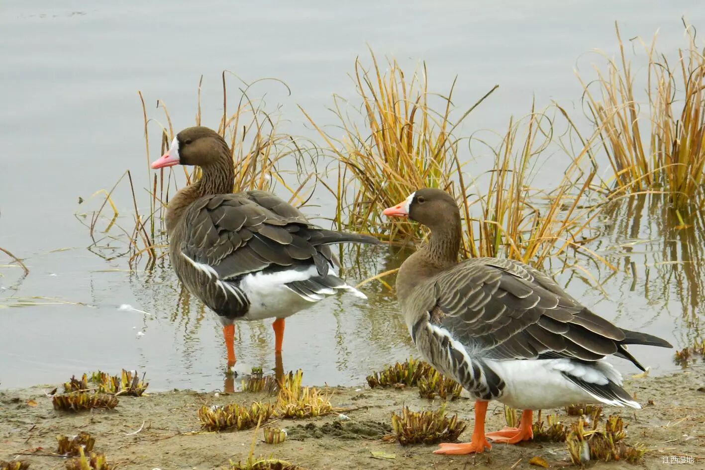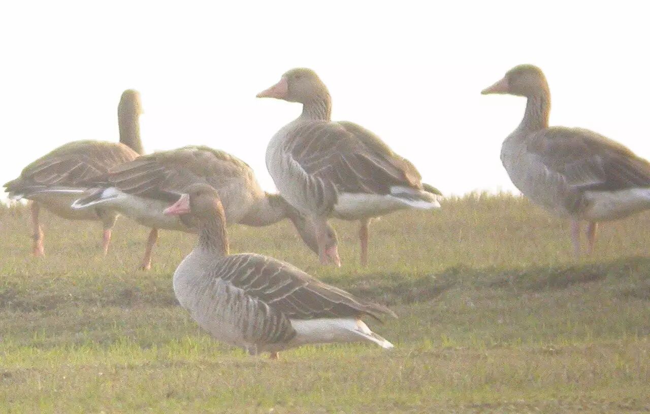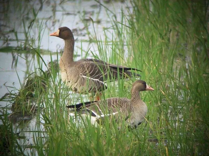 灰雁(雁形目,鸭科),冬候鸟,全长约85cm。羽色较其它雁类淡,以粉红色的嘴和脚为本种特征,背部灰褐色有白色边缘,下体污白色,并杂以暗褐色小块斑,胸浅烟褐色,尾上及尾下覆羽均白。飞行中浅色的翼前区与飞羽的暗色成对比。常成对或小群活动于开阔原野、湖泊、河流及附近沼泽地带,取食于矮草地和农耕地,以小虾、昆虫、螺、水生植物、种子等为食,繁殖于中国北方大部,结小群在中国南部及中部的湖泊越冬。
