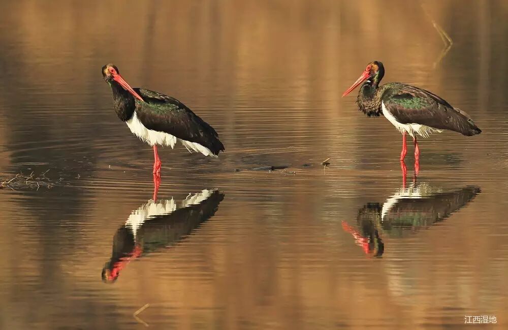 黑脸琵鹭(鹳形目,鹮科),冬候鸟,国家二级保护动物,全长约74cm。颈部带黄棕色环,枕后饰羽黄色。嘴黑色,眼先、眼周、与前额及嘴基形成一黑色区域。冬季饰羽较短,黄色消失。栖息于湖泊、沼泽及沿海滩涂等地。涉水觅食水生动物。常单独或小群活动。以小鱼、虾、蟹、软体动物和甲壳类动物为食。鄱阳湖区偶见。数量十分稀少,全世界总数2041只(2009年全球同步调查),韩国和中国东北部繁殖,被列为国际濒危鸟类。习性同白琵鹭。