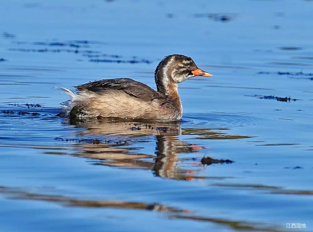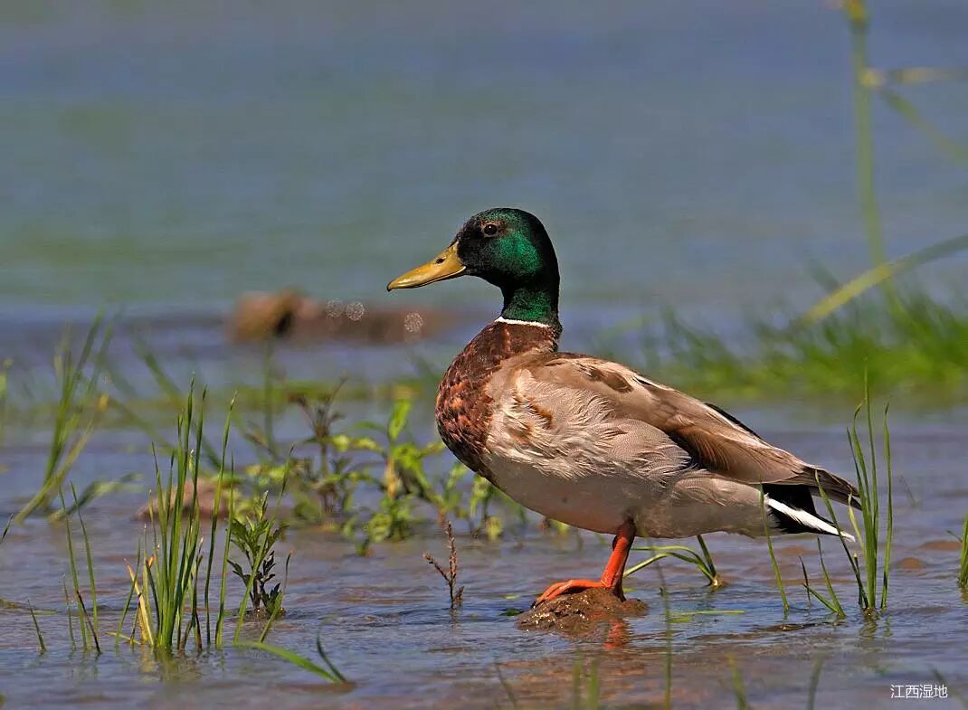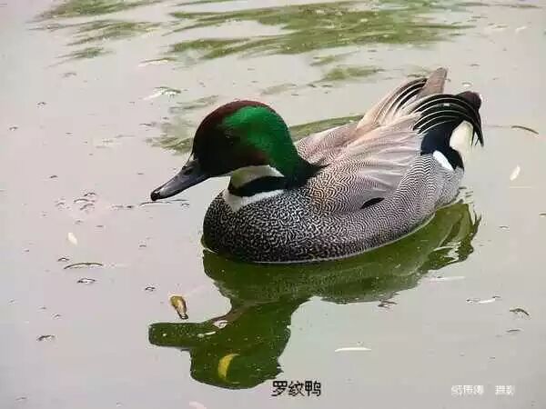 罗纹鸭(雁形目,鸭科)冬候鸟,省级重点保护鸟类,全长约50cm。头顶暗栗色,头和颈的两侧及颈部冠羽绿色,额有一小白斑。喉至前颈白色,前颈基处有一黑环。背部灰色。喜结大群,停栖水上,常与其它种类混合。常晨昏时在农田和湖边潜水处觅食,以水生植物、谷粒为食。