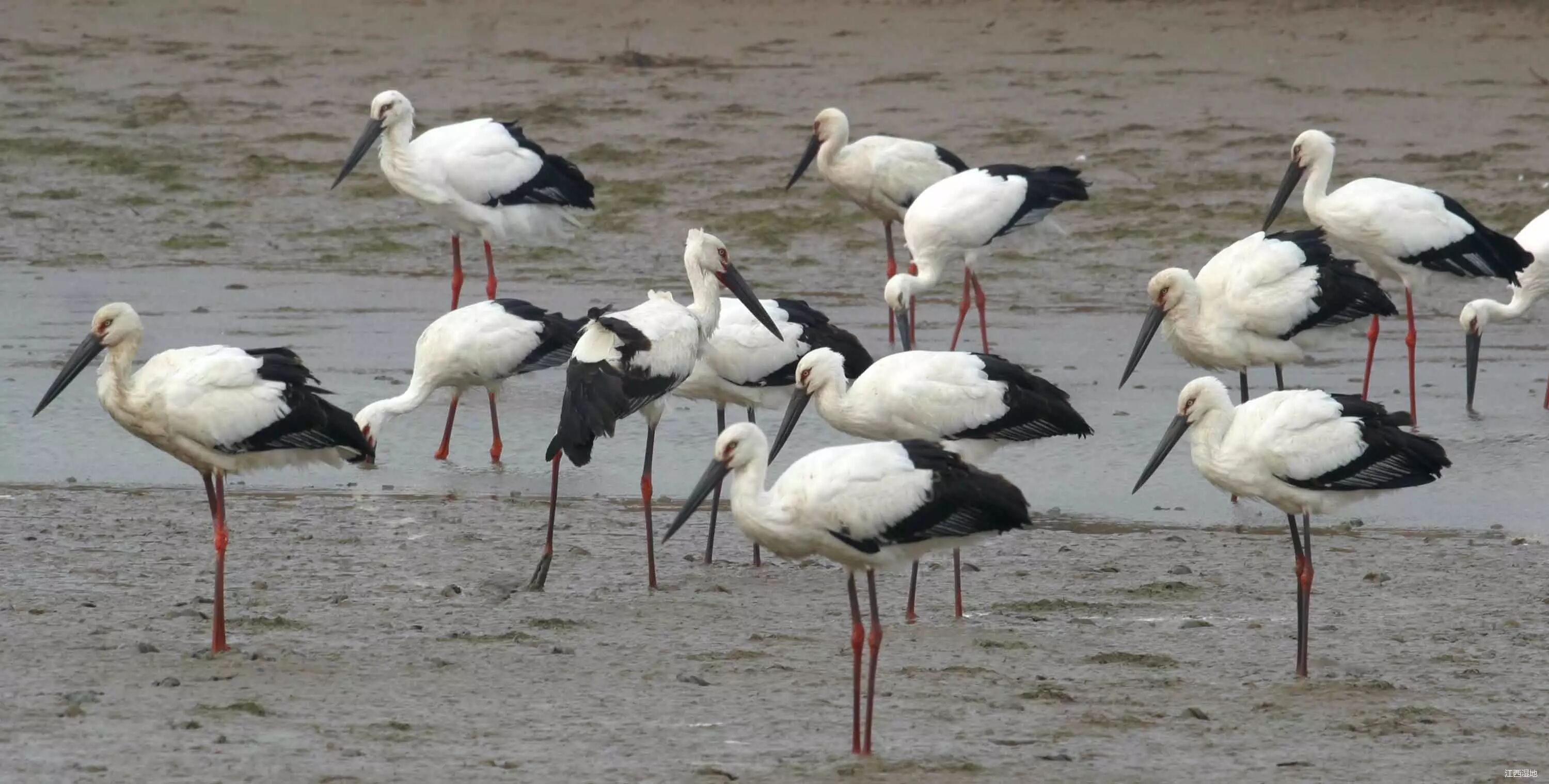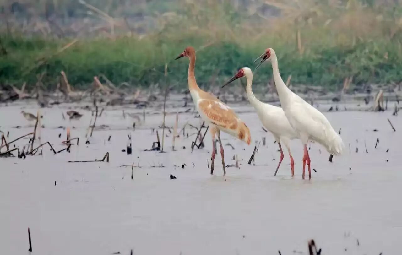 白鹤(鹤形目,鹤科),冬候鸟,国家Ⅰ级重点保护动物,全长约135cm。嘴橘黄,脸上裸皮猩红,腿粉红,飞行时黑色的初级飞羽明显。白鹤在江西是冬候鸟, 每年11月飞来鄱阳湖越冬,到翌春3月返回遥远的西伯利亚繁殖地。每年有超过全球种群数量98%以上的白鹤来到鄱阳湖越冬栖息。栖息于开阔平原、苔原的河、湖、池、沼浅水水域。于鄱阳湖以水位下降后露出的植物球茎及嫩根为食,偶食软体动物、甲壳类和昆虫。