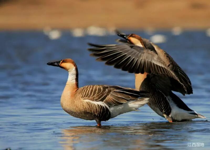 白额雁(雁形目,鸭科),冬候鸟,国家Ⅱ级重点保护动物,全长约90cm。上体大都灰褐色,额上和上嘴基部具有白色宽阔带斑环绕嘴基,腹部具大块黑斑,腿橘黄色,翼下羽色较灰雁暗,但比豆雁浅。冬季常集小群活动于沼泽、湖泊及草洲、芦苇丛,以植物种子、根茎、谷类、农作物的幼叶、嫩芽为食。飞行时队列多成“一”字形或“人”字形。