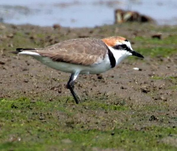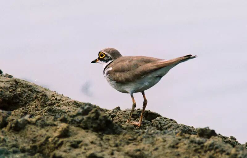 金眶鸻(鸻形目,鸻科),冬候鸟,全长约16cm。上体沙褐色,下体白色。有明显的白色领圈,其下有明显的黑色领圈,眼后白斑向后延伸至头顶相连。眼周、脚黄色。栖息于湖泊沿岸、河滩或水稻田边,以昆虫为主食,兼食植物种子、蠕虫等。