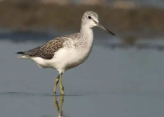 青脚鹬(鸻形目,鹬科),冬候鸟,全长约32cm。上体灰黑色,形长的腿近绿,灰色的嘴长而粗且略向上翻。站势:上体灰褐具杂色斑纹,翼尖及尾部横斑近黑;下体白色,喉、胸及两胁具褐色纵纹。背部的白色长条于飞行时尤为明显,翼下具深色细纹(小青脚鹬为白色)。喜栖息于沿海和内陆的沼泽地带及大河流的泥滩。通常单独或两三成群。进食时嘴在水里左右甩动寻找食物,头紧张地上下点动。