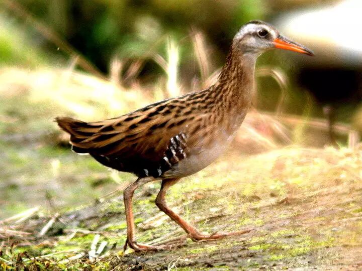 普通秧鸡(鹤形目,秧鸡科),夏候鸟,全长约29cm。上体多纵纹,顶冠棕色,背、两翼及尾多具白色细纹,颏白,颈及胸灰色,两胁具黑白色横斑。嘴细长,上嘴暗褐色,下嘴红色,微向下弯。脚淡绿色。性羞怯。栖于水域附近芦苇丛、灌木草丛或水稻田中,觅食植物种子和谷物,兼食昆虫。