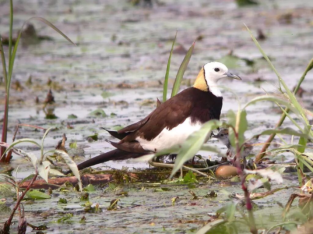水雉(鸻形目,水雉科),夏候鸟,省级重点保护鸟类,全长约33cm。上体灰褐色,头及颈前白色,枕部及后颈金黄色,尾较长、黑色,上胸白色,下胸、腹部及尾下覆羽黑色。黑色的贯眼纹下延至颈侧,下枕部金黄色。初级飞羽羽尖特长,形状奇特。常出没在莲塘、芦荡和池沼之间。趾和爪特别长,能轻步在莲叶上行走。以水生植物种子、水生昆虫、贝类、小鱼等为食。