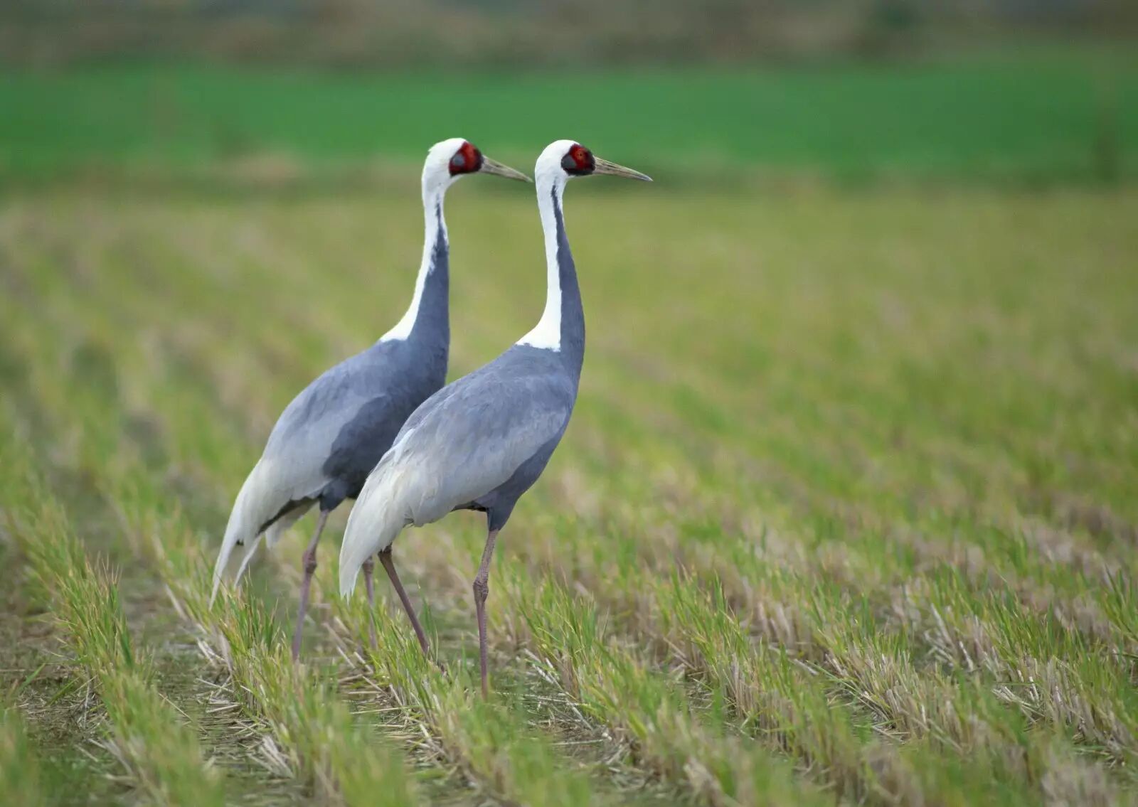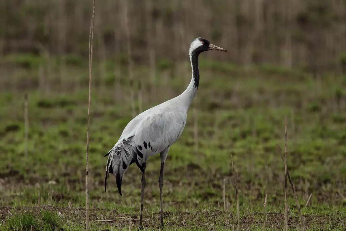 白枕鹤(鹤形目,鹤科),冬候鸟,国家Ⅱ级重点保护动物,全长约130cm.。体羽大致为石板灰色。脸侧裸皮红色、后方灰色,外缘黑色。喉及颈背白色。前颈下部黑灰色。枕、胸及颈前的灰色延至颈侧成狭窄尖线条。喜栖息于浅滩、沼泽湿地、草甸、水田等地,以植物种子、谷物、草籽为食。