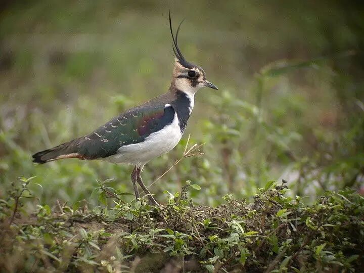 凤头麦鸡,(鸻形目,鸻科)冬候鸟,省级重点保护鸟类,全长约32cm。雄鸟上体具绿黑色金属光泽,胸近黑,腹部白色,有长窄的黑色反翻型凤头,尾白而具宽的黑色次端带;头顶色深,耳羽黑色,头侧及喉部污白。喜栖息于滩涂地、沼泽、苇塘、稻田和矮草地,以植物种子、蚯蚓、蜗牛、昆虫等为食。