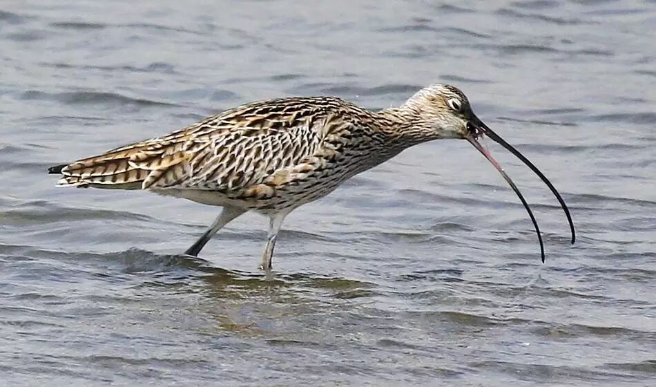 中杓鹬(鸻形目,鹬科),冬候鸟,省级重点保护鸟类,全长约41cm。嘴黑色,长而下弯,眉纹色浅,具黑色顶纹,脚黑色,腰白色,尾羽褐色,有黑褐色横斑。迁徙时常见于中国大部地区,尤其于华东及华南沿海几处河口地带,通常结小至大群,常与其他涉禽混群。栖息于河口、海岸、滩涂、沼泽、草地、耕地等,以浆果、环节动物、小鱼、昆虫等为食。