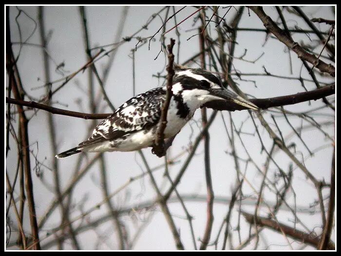 斑鱼狗(佛法僧目,鱼狗科),留鸟,体长约27cm。黑白色鱼狗。冠羽较小,具显眼白色眉纹。上体黑而多具白点。下体白色,上胸具黑色的宽阔条带,其下具狭窄的黑斑。雌鸟胸带不如雄鸟宽。虹膜褐色,嘴黑色,脚黑色。常成对或结群活动于较大水体及树林,喜嘈杂。惟一常盘桓水面寻食的鱼狗。