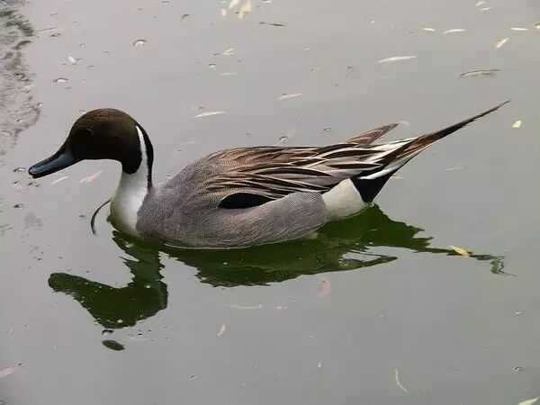 针尾鸭(雁形目,鸭科)冬候鸟,省级重点保护鸟类,全长约65cm。雄鸟背部灰色,杂以黑色波状细纹,肩羽黑色,头顶暗褐色,灰色的颈部两侧具特征性白色图纹,颈侧与下体连成鲜明的白色,胸侧多近白色纹。翼镜铜绿色,尾黑,中央一对尾羽特别长。喜沼泽、湖泊、大河流及沿海地带。常在水面取食,有时探入浅水。主要以植物的嫩叶、芽为食,能挖食浅水地带的水生植物茎为食,有时也捕食水生昆虫、软体动物等。