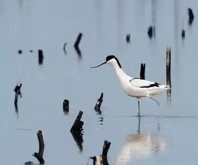 反嘴鹬(鸻形目,反嘴鹬科),冬候鸟,省级重点保护鸟类,全长约43cm。嘴黑色细长上翘,身体只有黑白两色,飞行时从下面看体羽全白,仅翼尖黑色。翼上及肩部具黑色的带斑,其余体羽白色。繁殖期常单独或成对活动,非繁殖期则结成小群,在水边浅水处涉水觅食。进食时嘴往两边扫动。善游泳,能在水中倒立。飞行时不停地快速振翼并作长距离滑翔。以甲壳类、昆虫和软体动物为主食。