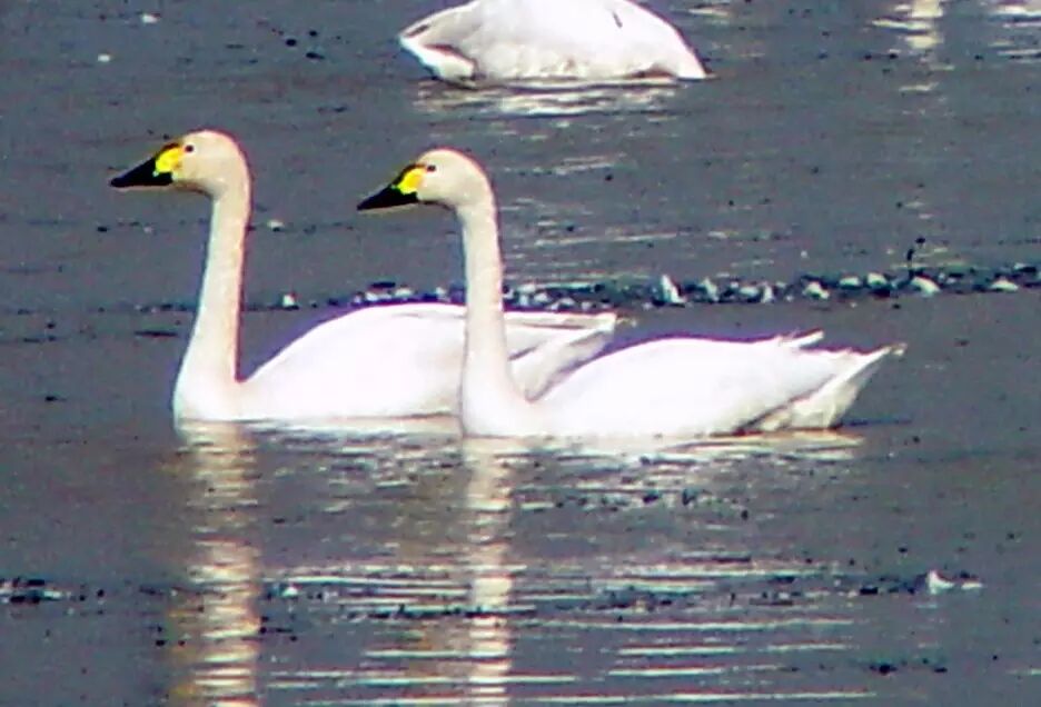 小天鹅(雁形目,鸭科),国家Ⅱ级重点保护动物,全长约110cm。体羽洁白,嘴黑色,嘴基两侧黄斑沿嘴缘不前伸于鼻孔之下。比大天鹅小,但易混淆。喜栖息于湖泊、库塘中,以水生植物的根、茎和种子为食,也兼食少量水生昆虫和螺类。