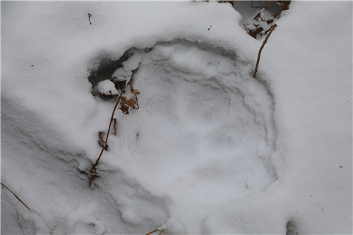从第一现场到第二现场的雪地上,发现了东北虎一来一去的足迹,同时,在第二现场东北虎进食地方的不远处,发现了东北虎卧着的痕迹。