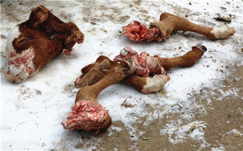 工作人员到达位于四海店林场44林班30小班的第一现场后,雪地上有牛蹄印和东北虎足迹,虎的足迹从东面而来。从现场分析,老虎扑倒牛后向北面林子里拖拽,延拖痕前行大概有1000米左右来到第二现场,现场遗留有牛头和牛蹄、牛皮以及部分牛内脏,其余部分都不见了,都被东北虎吃掉了。